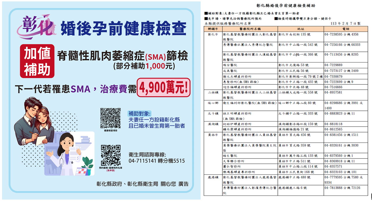 發布日期:113-05-02 彰化縣提供婚後孕前健康檢查補助計畫,透過婚後孕前健康檢查,可及早發現、預防與治療孕期可能產生的疾病,降低孕期風險。凡夫妻任一方設籍本縣且已婚未曾生育第一胎者,即日起皆可持身分證及健保卡至本縣21家合約醫療院所進行檢查(詳如圖檔)。 聯絡資訊 服務科室 保健科 服務人員 陳靖鈴 服務電話 04-7115141 轉 5511 服務傳真 04-7121309 健康主題 婦女健康管理專區
