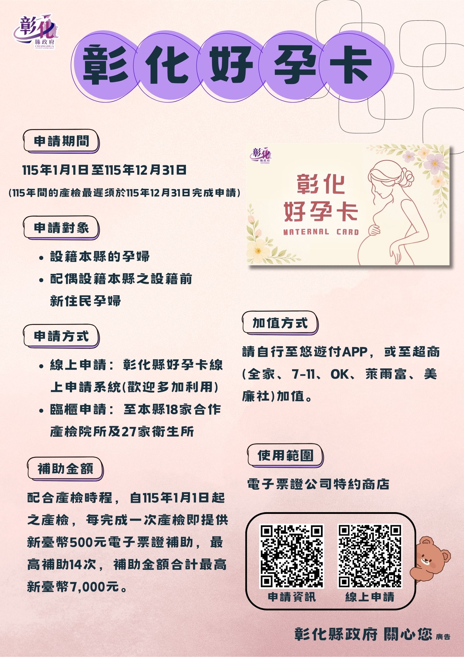為體貼鼓勵準媽媽懷孕及協助孕育健康下一代,本縣於115年起推出「好孕卡」補助方案,本方案結合中央14次公費產檢服務,孕婦自115年1月1日起之產檢,每完成一次即可獲得本縣提供的500元電子票證補助,最高補助14次、共計7,000元,以鼓勵孕婦定期接受產檢。
