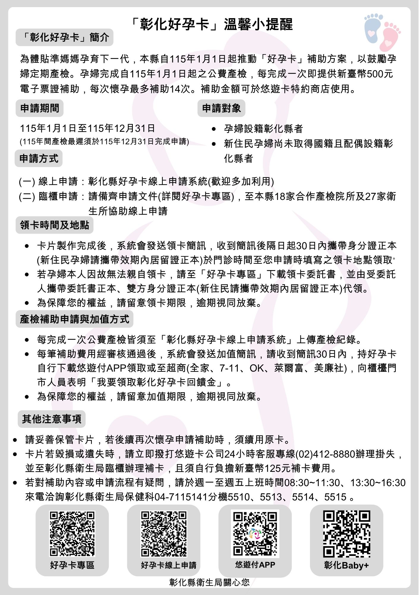 - 彰化好孕卡 領卡地點及時段一覽表 https://www.chshb.gov.tw/media/2281020266#gsc.tab=0