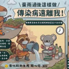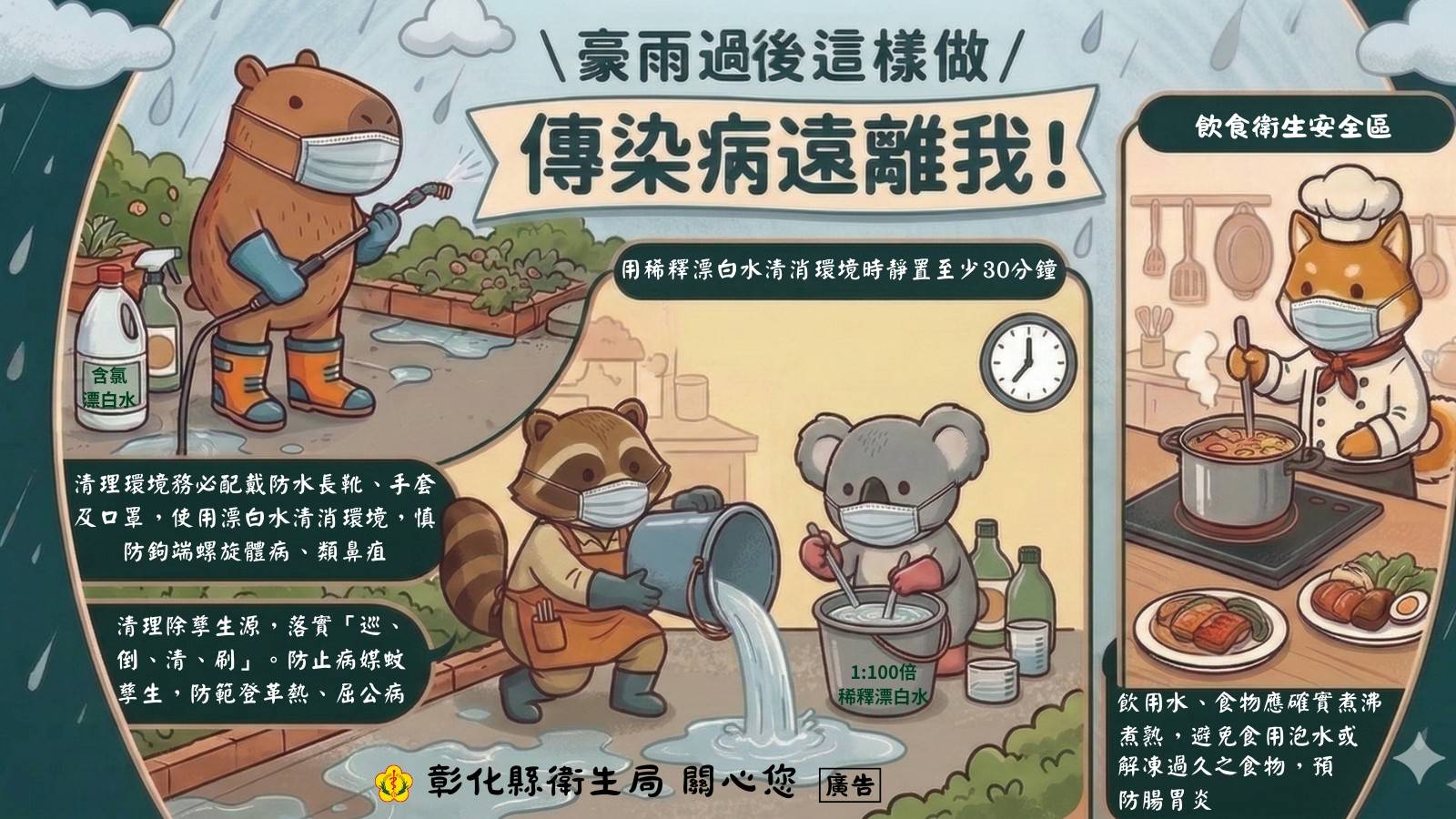 ✅災後清理環境:戴口罩、穿防水長靴手套,用漂白水消毒。慎防鉤端螺旋體病、類鼻疽。
